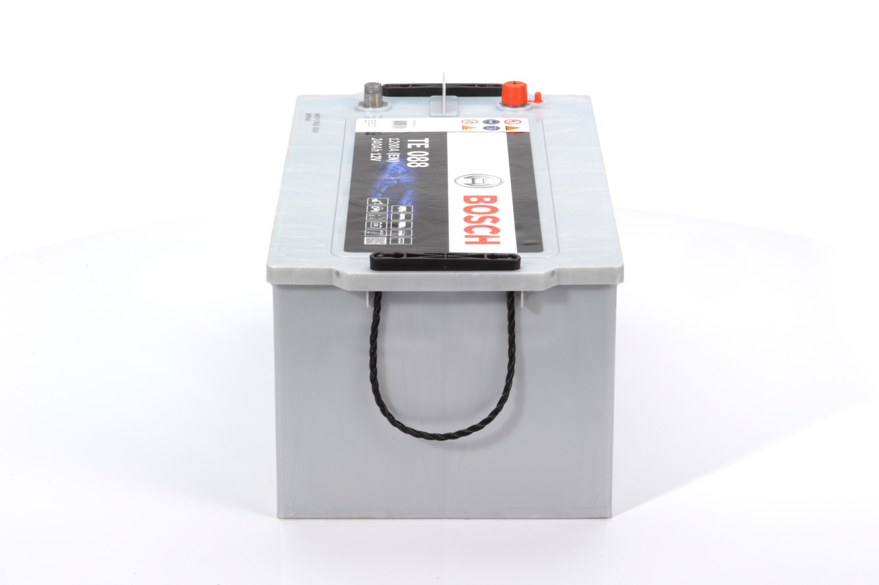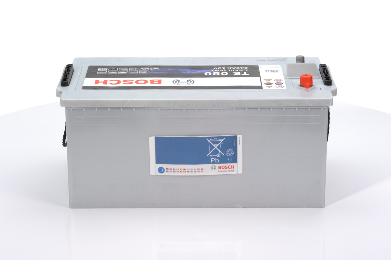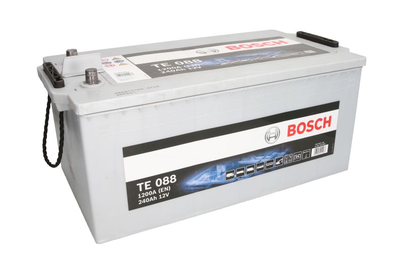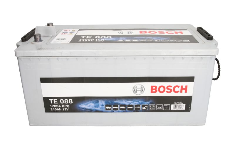 Δυνατότητα δόσεων για αγορές άνω των 50€ Η μπαταρία φορτηγού TE088 της εταιρείας Bosch, έχει χωρητικότητα 240 αμπερώρια (Αh) και ισχύ εκκίνησης CCA 1200 αμπέρ (A). Όσο μεγαλύτερη είναι η χωρητικότητα, τόσο περισσότερο μπορεί να κρατήσει η μπαταρία χωρίς φόρτιση. Στο εγχειρίδιο του αυτοκινήτου αναφέρεται ο κωδικός που μας δείχνει το μέγεθος και τον τύπο της μπαταρίας, που είναι ιδανικός για το κάθε όχημα.